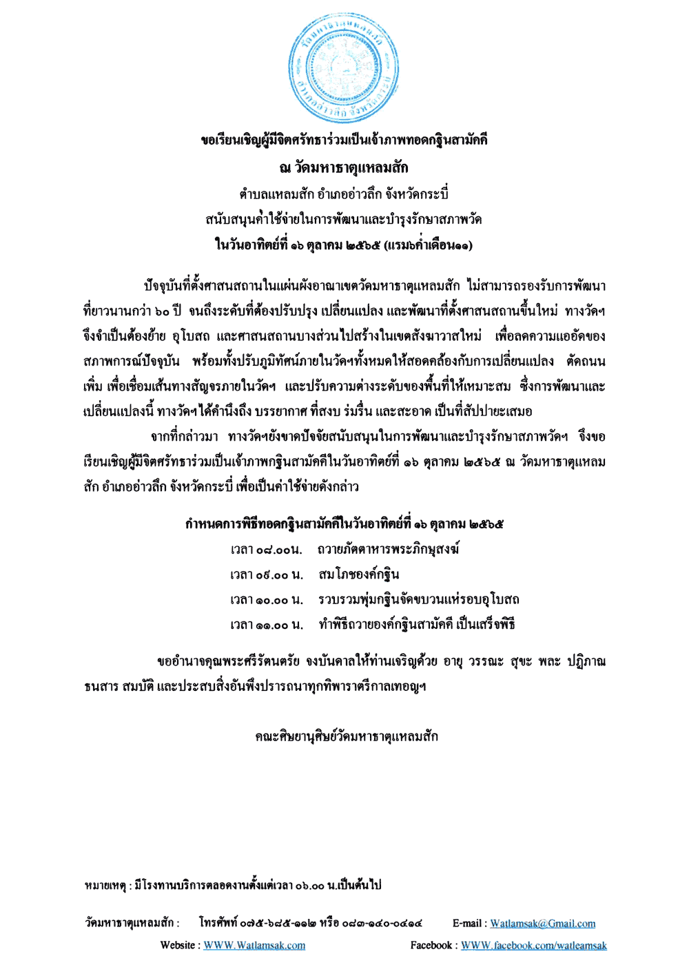 ขอเรียนเชิญผู้มีจิตศรัทธาร่วมเป็นเจ้าภาพทอดกฐินสามัคคี ณ วัดมหาธาตุแหลมสัก ในวันอาทิตย์ที่ 16 ตุลาคม 2565