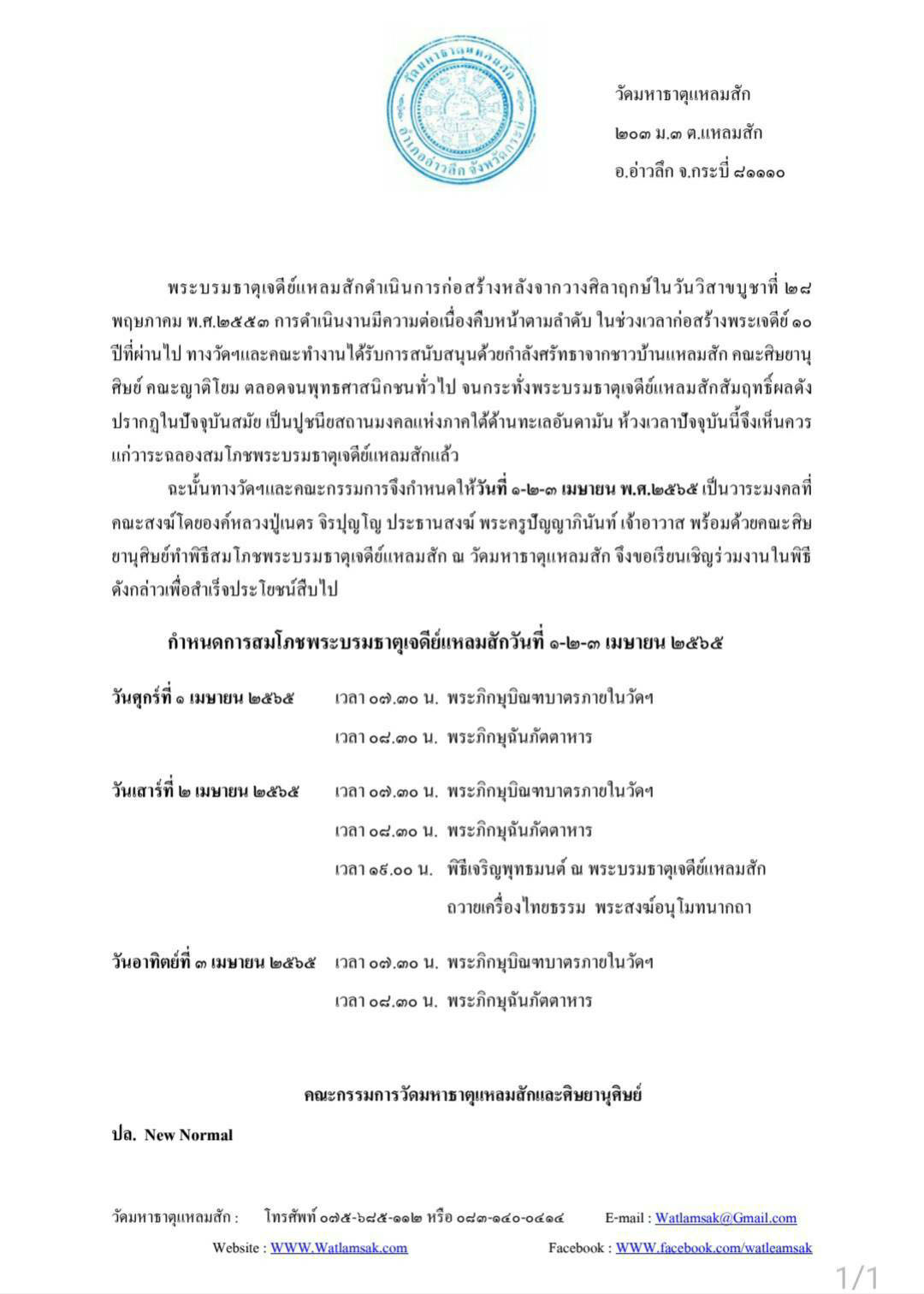 กำหนดการสมโภชพระบรมธาตุเจดีย์แหลมสักวันที่ 1-2-3 เมษายน 2565