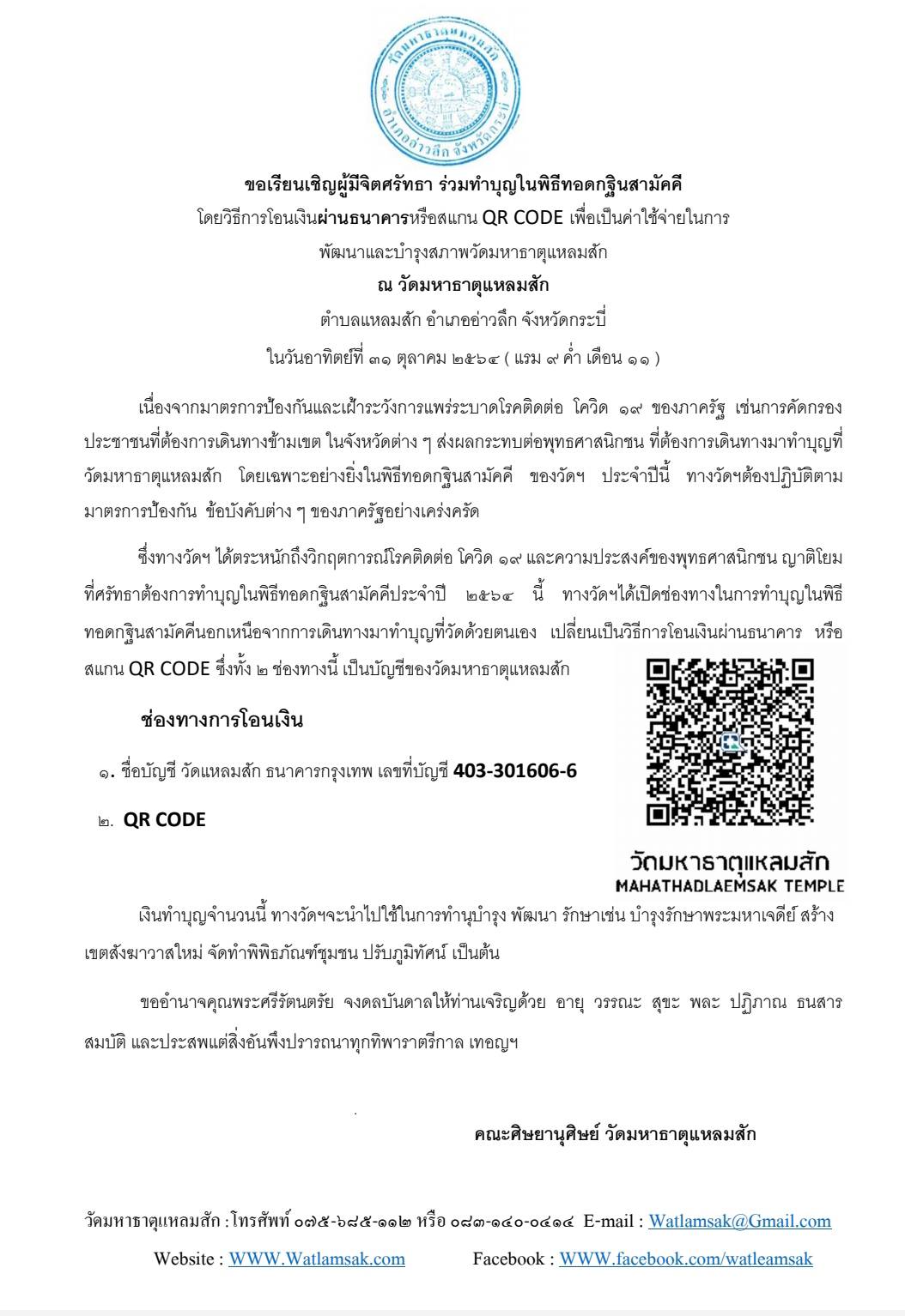 ขอเรียนเชิญผู้มีจิตศรัทธา ร่วมทำบุญในพิธีทอดกฐินสามัคคี ด้วยวิธีการโอนเงินผ่านธนาคาร หรือสแกน QR CODE เพื่อเป็นค่าใช้จ่ายในการพัฒนาและบำรุงสภาพวัดมหาธาตุแหลมสัก ณวัดมหาธาตุแหลมสัก ตำบลแหลมสัก อำเภออ่าวลึก จังหวัดกระบี่ ในวันอาทิตย์ที่ 31 ตุลาคม 2564 (แรม 9 ค่ำเดือน 11)