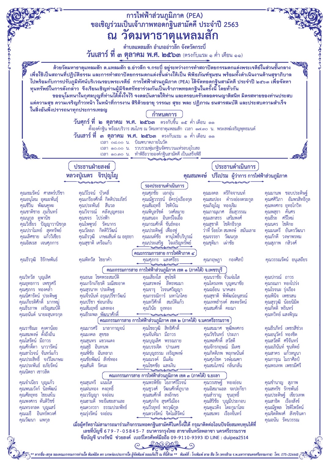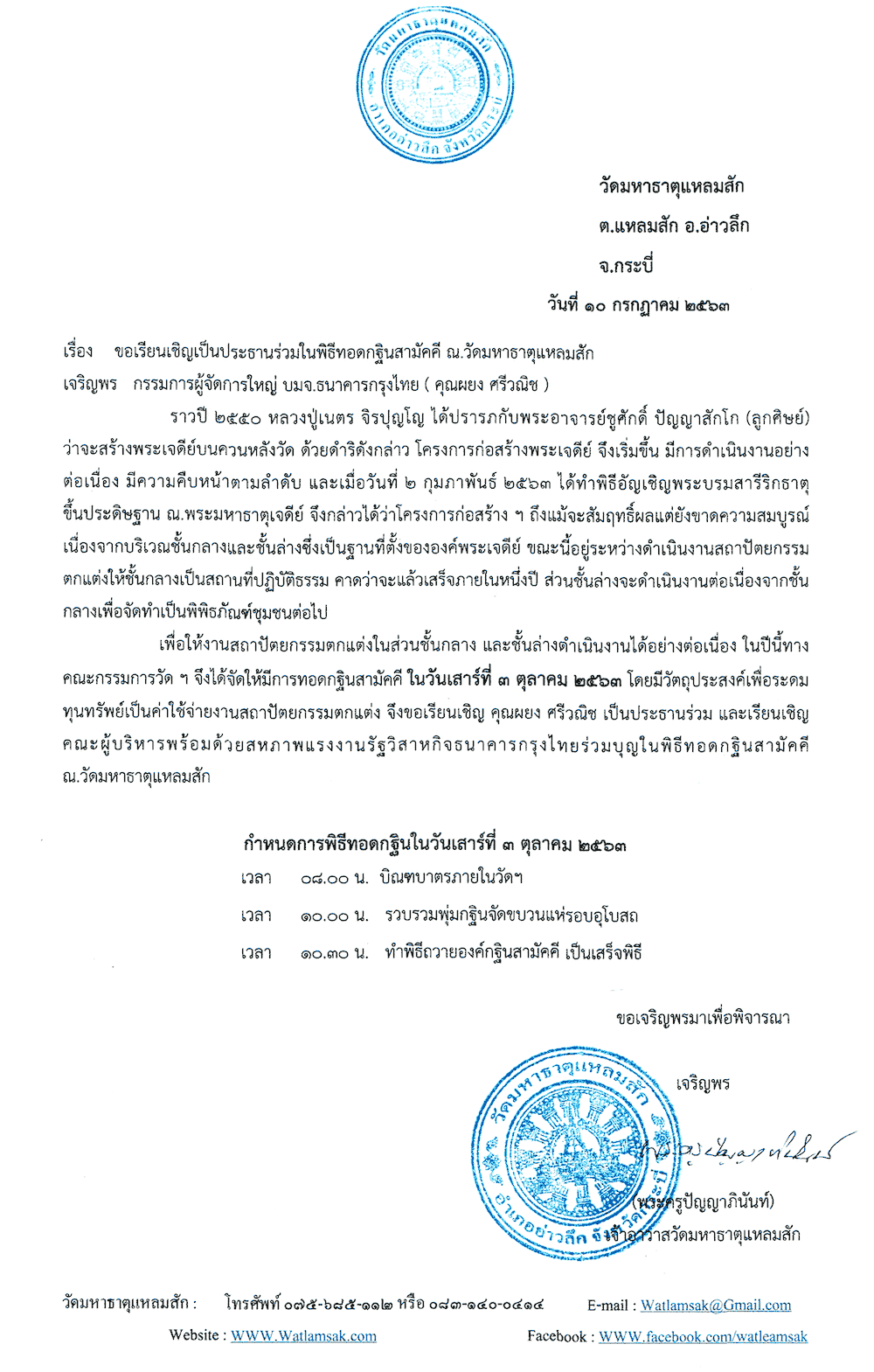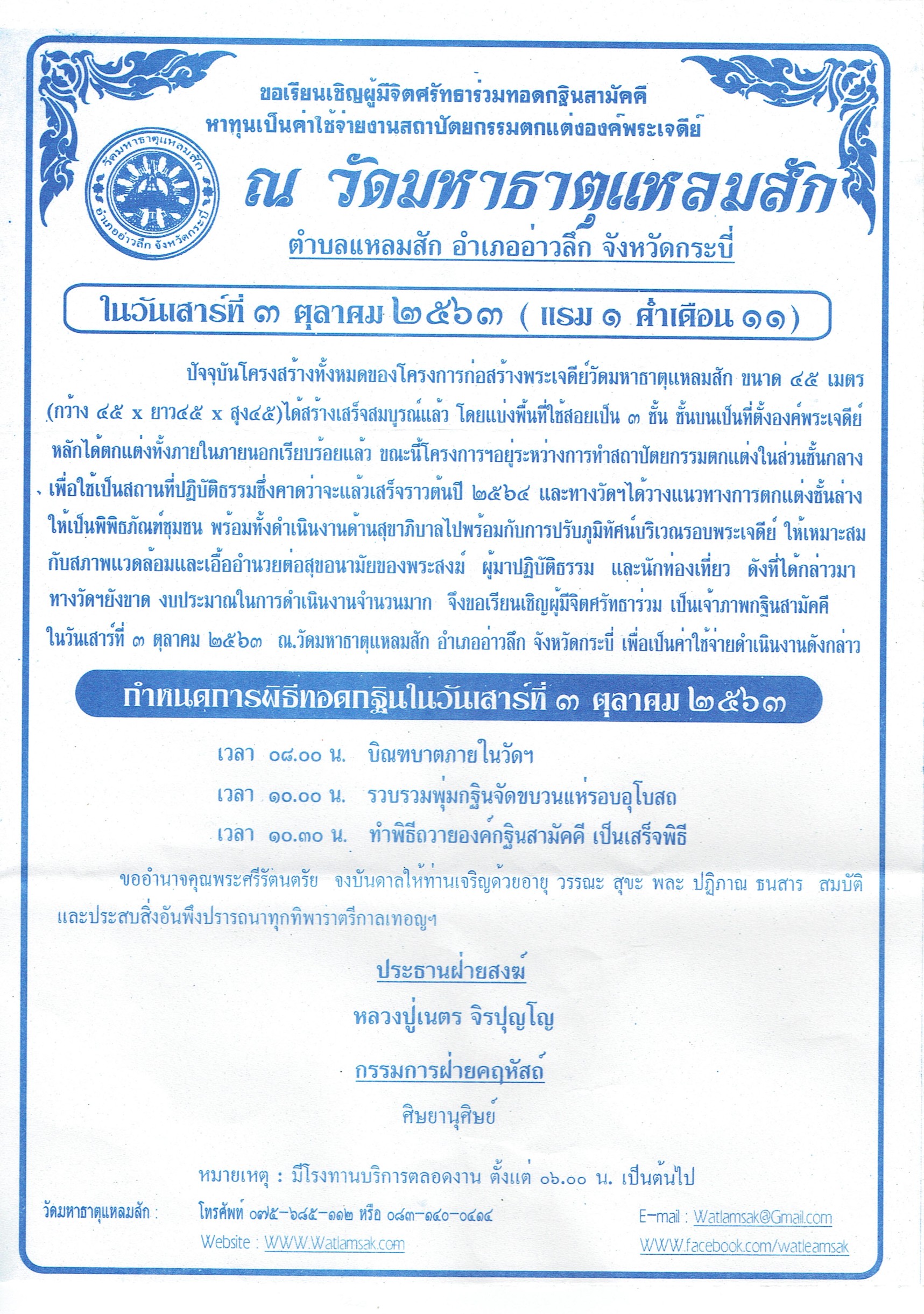 กำหนดการพิธีทอดกฐินในวันเสาร์ที่ ๓ ตุลาคม ๒๕๖๓