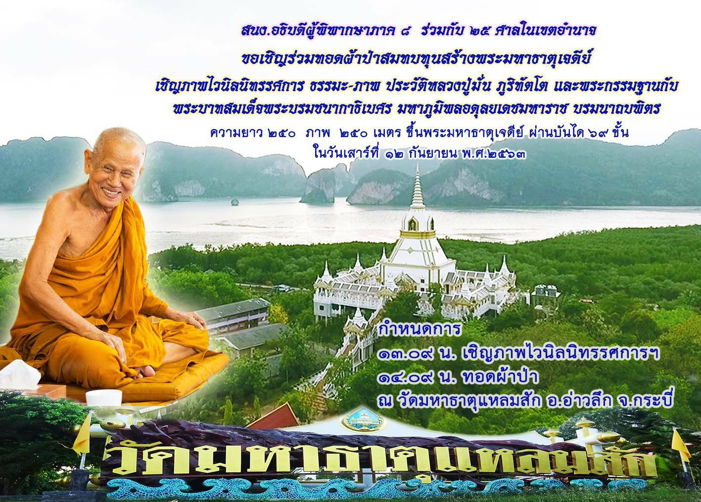 สำนักงาน อธิบดีผู้พิพากษาภาค 8 ร่วมกับ 25 ศาลในเขตอำเภอ ขอเชิญร่วมทอดผ้าป่าสมทบทุนสร้างพระมหาธาตุเจดีย์แหลมสัก ในวันเสาร์ที่ 12 กันยายน 2563 เชิญภาพไวนิลนิทรรศการ ธรรมะ-ภาพ ประวัติหลวงปู่มั่น ภูริทัตโต และพระกรรมฐานกับ พระบาทสมเด็จพระบรมชนากาธิเบศร มหาภูมิพลอดุลยเดชมหาราช บรมนาถบพิตร ความยาว 250 ภาพ 250 เมตร ขึ้นพระมหาธาตุเจดีย์ ผ่านบันได 69 ขั้น ในวันเสาร์ที่ 12 กันยายน พ.ศ.2563