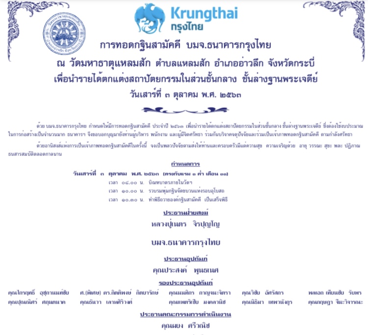 ขอเชิญร่วมเป็นเจ้าภาพทอดกฐินสามัคคี ประจำปี 2563 ณ วัดมหาธาตุแหลมสัก ตำบลแหลมสัก อำเภออ่าวลึก จังหวัดกระบี่ ในวันเสาร์ที่ 3 ตุลาคม 2563 (แรม 1 ค่ำ เดือน 11)