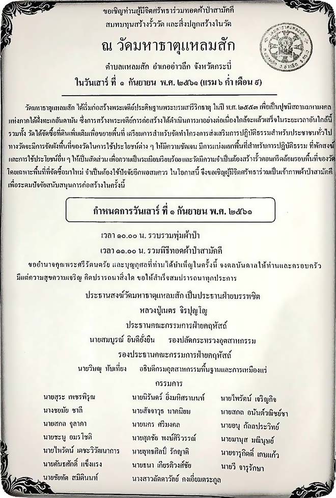 เรียนเชิญพุทธศาสนิกชนร่วมทำบุญทอดกฐินสามัคคีสร้างเจดีย์วัดมหาธาตุแหลมสัก ในวันอาทิตย์ที่ 11 พฤศจิกายน 2561