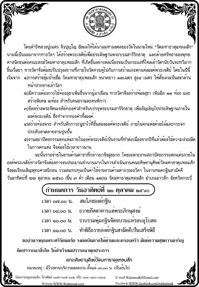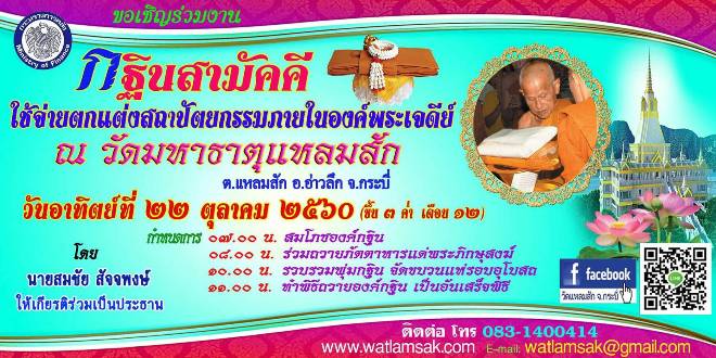 ขอเชิญร่วมงานกฐินสามัคคี ณ วัดมหาธาตุแหลมสัก วันที่ 22 ตุลาคม 2560 (ขี้น 3 ค่ำ เดือน 12)