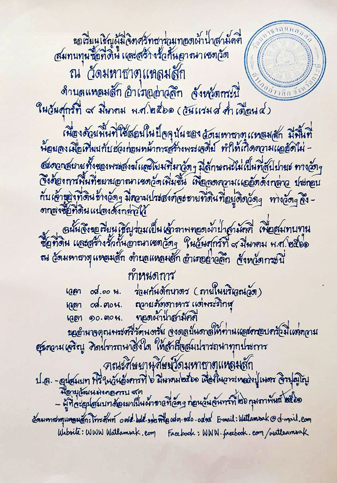 ขอเรียนเชิญผู้มีจิตศรัทธาร่วมทอดผ้าป่าสามัคคี สมทบทุนซื้อที่ดิน และสร้างรั้ว ณ วัดมหาธาตุแหลมสัก ในวันศุกร์ที่ 9 มีนาคม 2561